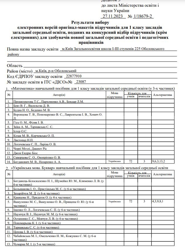 Вибір та замовлення навчальних посібників для учнів 1-х класів та педагогічних працівників Школи І-ІІІ ступенів №225 Оболонського району м.Києва