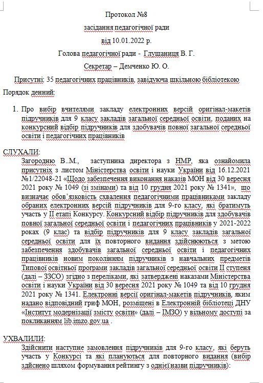 Протокол №7 засідання педагогічної ради від 02.02.2021р. (про вибір та замовлення підручників для 4-х класів на 2021/2022 н.р.)