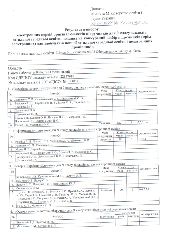 Вибір та замовлення навчальних посібників для учнів 11-х класів та педагогічних працівників Школи І-ІІІ ступенів №225 Оболонського району м.Києва