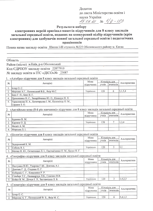 Вибір та замовлення підручників для учнів 8-х класів та педагогічних працівників Школи І-ІІІ ступенів №225