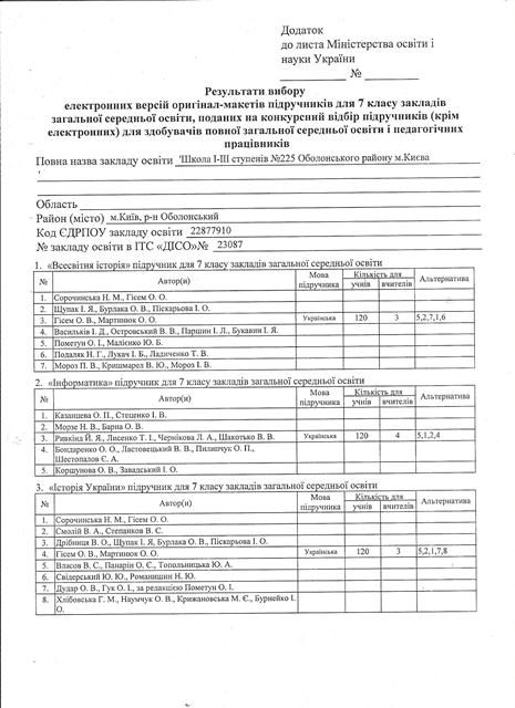 Вибір та замовлення навчальних посібників для учнів 7-х класів та педагогічних працівників Школи І-ІІІ ступенів №225 Оболонського району м.Києва