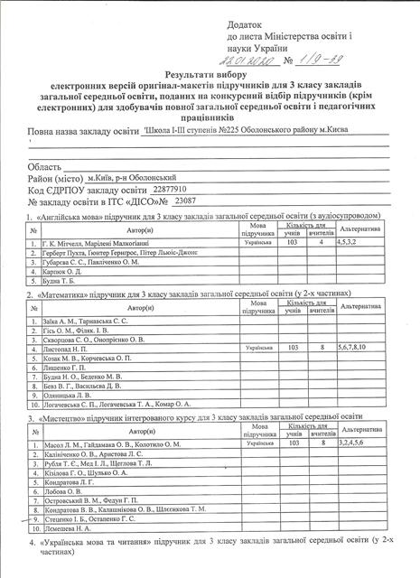 Вибір та замовлення навчальних посібників для учнів 2-х класів та педагогічних працівників Школи І-ІІІ ступенів №225 Оболонського району м.Києва